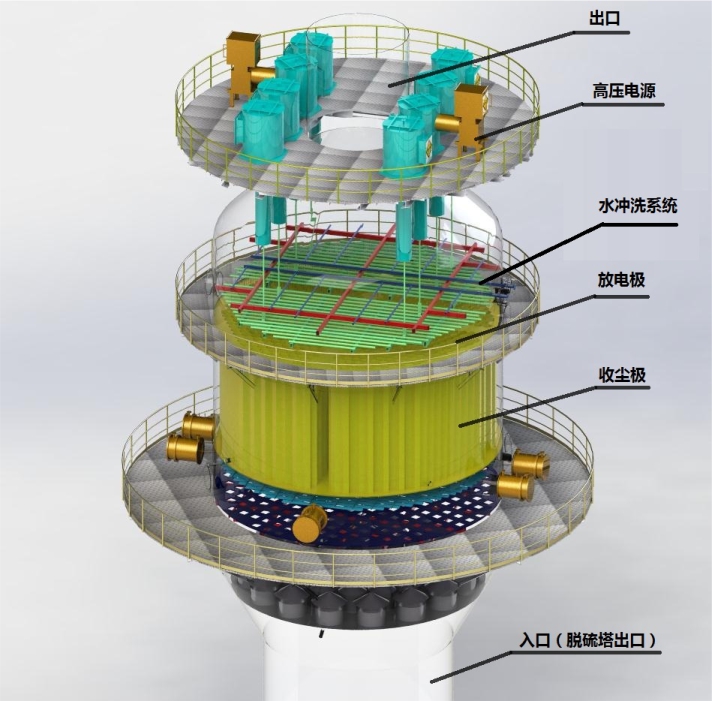 主要由殼體、進(jìn)口煙箱、陰極系統(tǒng)、陽極板/管、水沖洗系統(tǒng)(循環(huán)水系統(tǒng))、高壓電源、出口煙箱、氣流分布板、電控系統(tǒng)等組成。